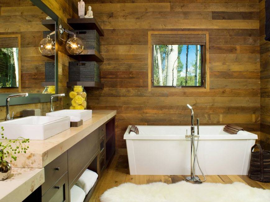 Для оформления ванной комнаты в деревянном доме можно использовать различные дизайнерские решения и идеи. Выбирая стиль, лучше остановиться на одном из следующих вариантов: