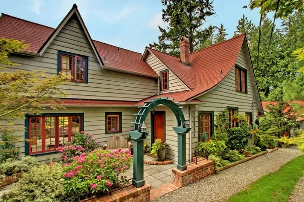 Когда коттедж окружен большим количеством растений, стоит выделить фасад частного дома красным цветом. Это можно сделать через покраску стен или использовать для отделки панели, имитирующие кирпичную кладку.