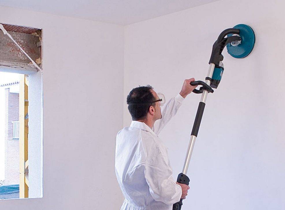 Следом стену тщательно шпаклюют целиком, а после высыхания этого слоя его шлифуют пемзой или мелкофракционной шкуркой. Чтобы удалить пыль и мелкие части мусора, поверхность обдувают прохладным воздухом из фена (компрессора) или протирают сухой ветошью.