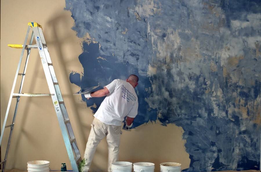 После просыхания стен наносим венецианскую штукатурку своими руками. До работы со смесью верхнюю часть стены и потолок проклеивают малярным скотчем. Стену облицовывают небольшими участками по 1 метру кв., начиная работы с верхней ее части. При нанесении венецианской штукатурки используют кельму, на которую штукатурка наносится при помощи шпателя. Кельму передвигают по стене обрывочными, короткими и округлыми движениями слева направо.