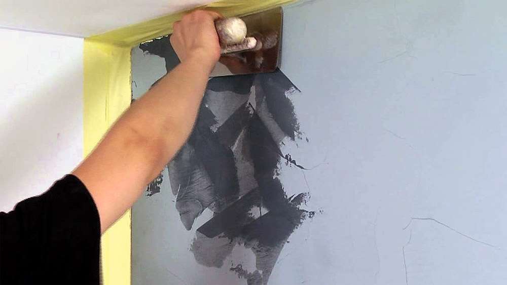 Нанесенную тонким слоем массу распределяют по поверхности специальным венецианским шпателем, держа его под углом 15 градусов к стене и передвигая в разные стороны дугообразными движениями так, чтобы не образовывалось прямых стыков линий.