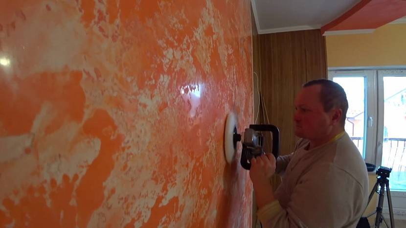 На поверхность воск наносят ворсовой перчаткой, после чего стену полируют шлифмашинкой с полирующей насадкой.