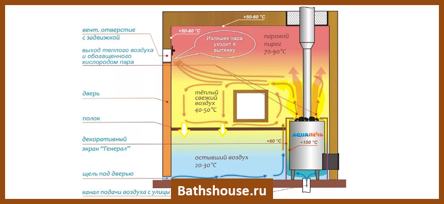 - Приток воздуха осуществляется за каменкой через отверстие, находящееся на расстоянии 30-40 см от уровня пола. При этом вытяжное отверстие имеет аналогичную высоту, но располагается на противоположной от притока воздуха стене и оснащается вентилятором. Поступивший в помещение холодный воздух ударяется о стенку каменки и устремляется вверх, постепенно прогреваясь в процессе подъема. В это же время отработанный воздух начинает движение вниз и под действием вентилятора выводится наружу. Такое перемешивание воздушных масс приводит к равномерности нагревания воздуха.