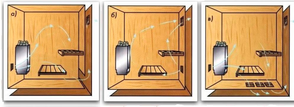 При такой схеме вентиляции парная прогревается быстрее и соответственно экономится топливо.