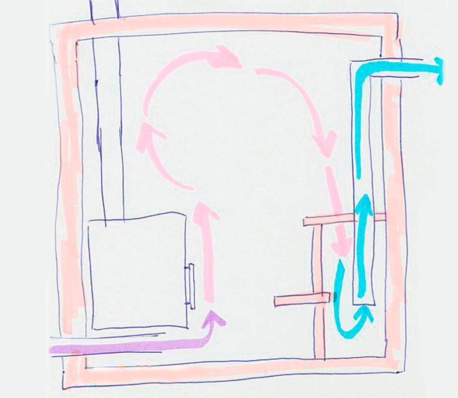 Если печь установлена не в парилке, используется другая схема вентиляции: