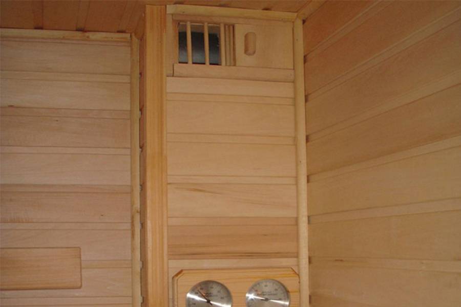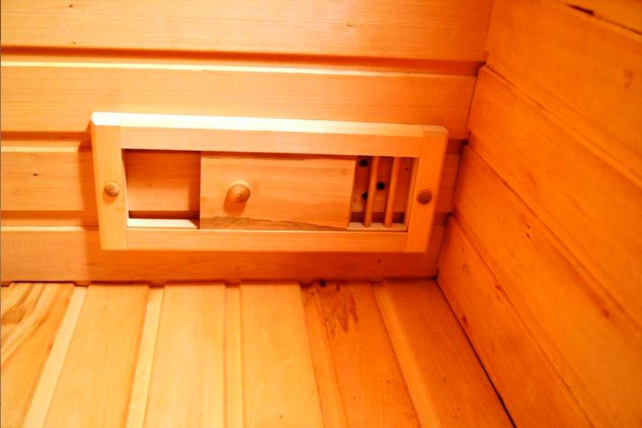 Самый простой способ получения воздуха для дыхания в парной – расположение небольшого окошка рядом с полком и двери в предбанник. Окно и дверь открывают между заходами во время отдыха. По возвращении в парную закрывают и снова парятся.