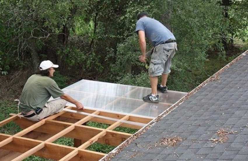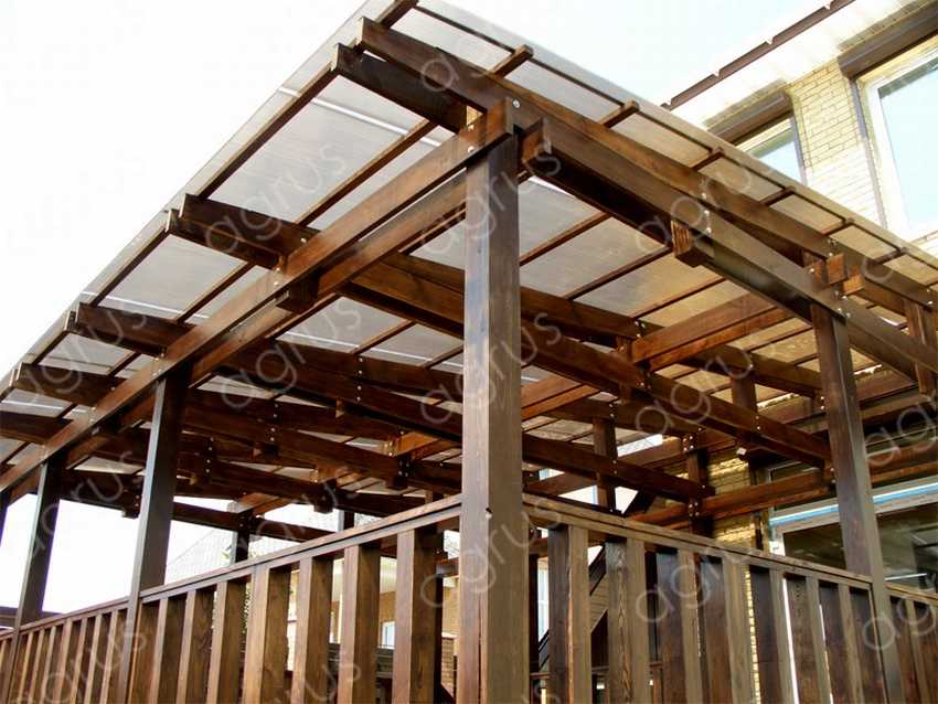- Крыша. Может быть прозрачной (из стекла или поликарбоната) и глухой. Во втором случае может применяться шифер, рубероид, ондулин, черепица и профилированный лист. От железного покрытия следует отказаться, так как при простоте монтажа и доступной стоимости во время дождя оно издает очень сильный шум.