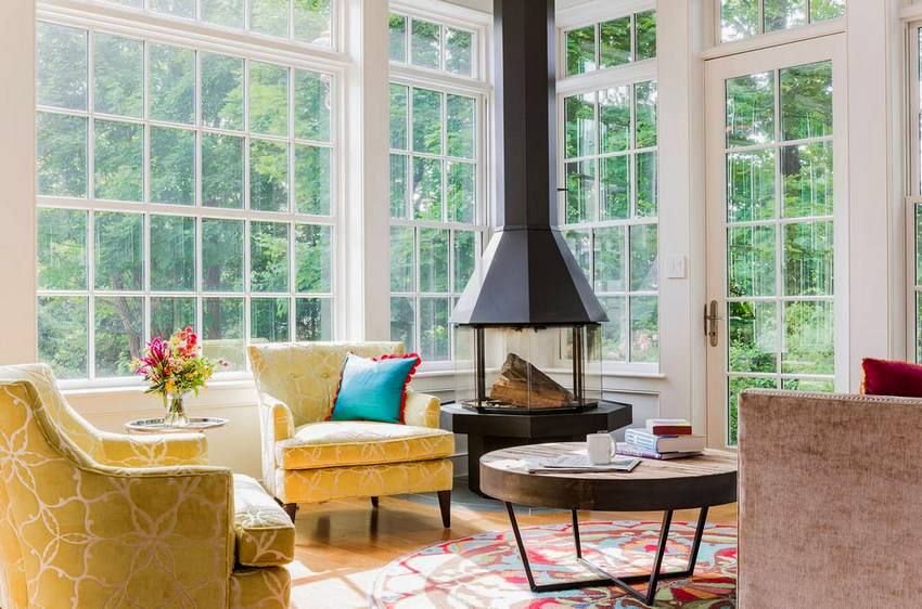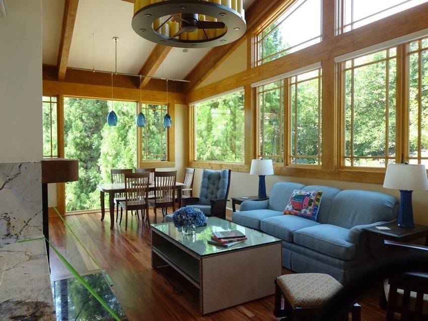 Окна веранды, выходящие в сад, помогут любоваться природой в любое время года
