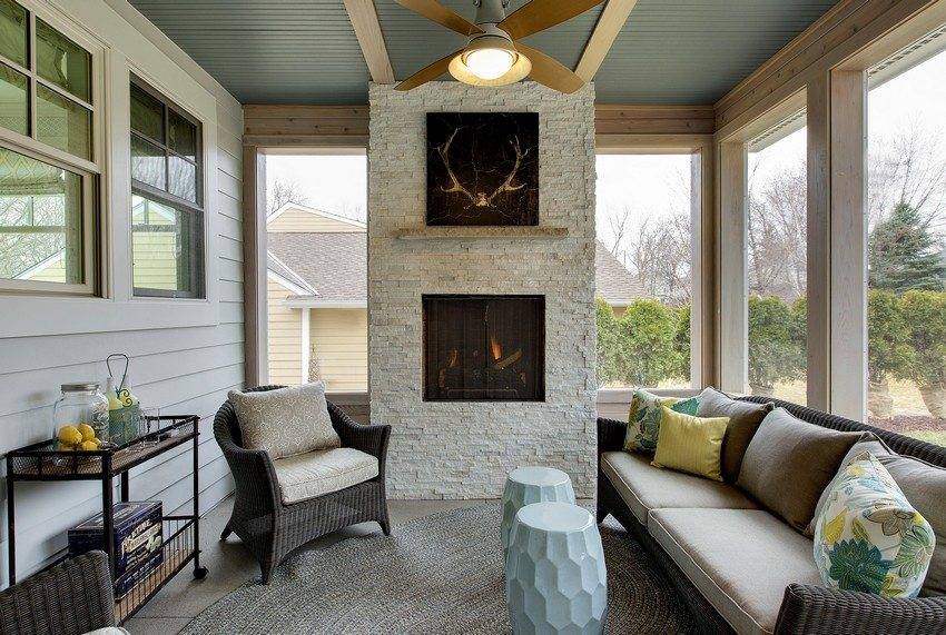 Украшением любой веранды станет настоящий, декоративный камин или очаг на биотопливе. Отлично впишутся в интерьер пристройки деревянные полки, на которые можно ставить книги, сувениры, свечи, фотографии и прочие небольшие предметы, поднимающие людям настроение.
