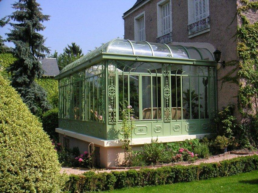 Закрытая веранда, выполненная из металла и стекла, с крышей из поликарбоната