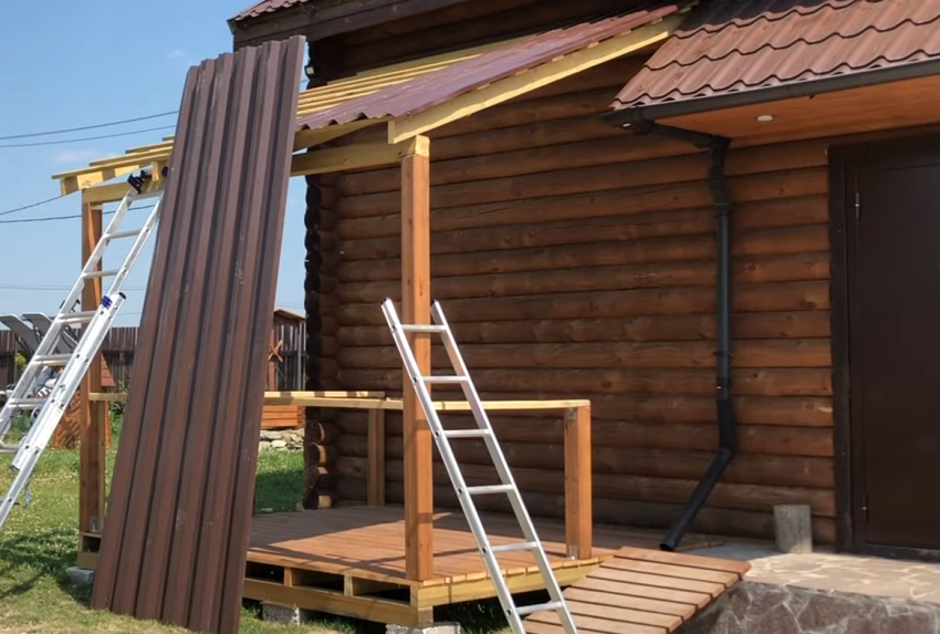 Кровля у веранды, как правило, односкатная. Ее монтаж включает следующие этапы: