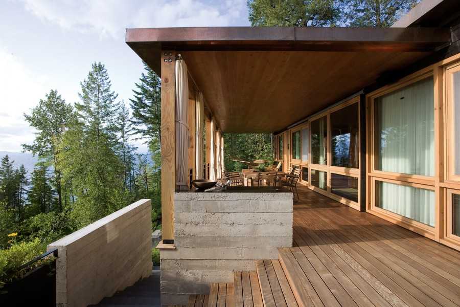 Крытая веранда у дома, в свою очередь, также бывает теплой или холодной. Проще всего построить веранду с окнами в пол, но учтите, что этот вариант будет плохо сохранять тепло и не подойдет для суровых зим. Поэтому в условиях сильных перепадов температур, остекленную веранду используют только в качестве летней кухни.