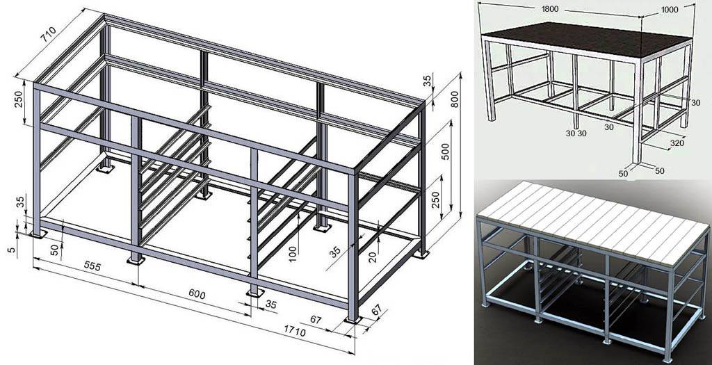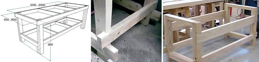 Под нагрузку 200/600 подойдет более удобный металлический верстак по схеме справа вверху из профтрубы 50х50 (угловые стойки), 30х30 (прочие вертикальные детали) и уголка 30х30х3. Дощатая подушка того и другого верстака настилается только поперек (справа внизу) из шпунтованных досок (120…150)х40.