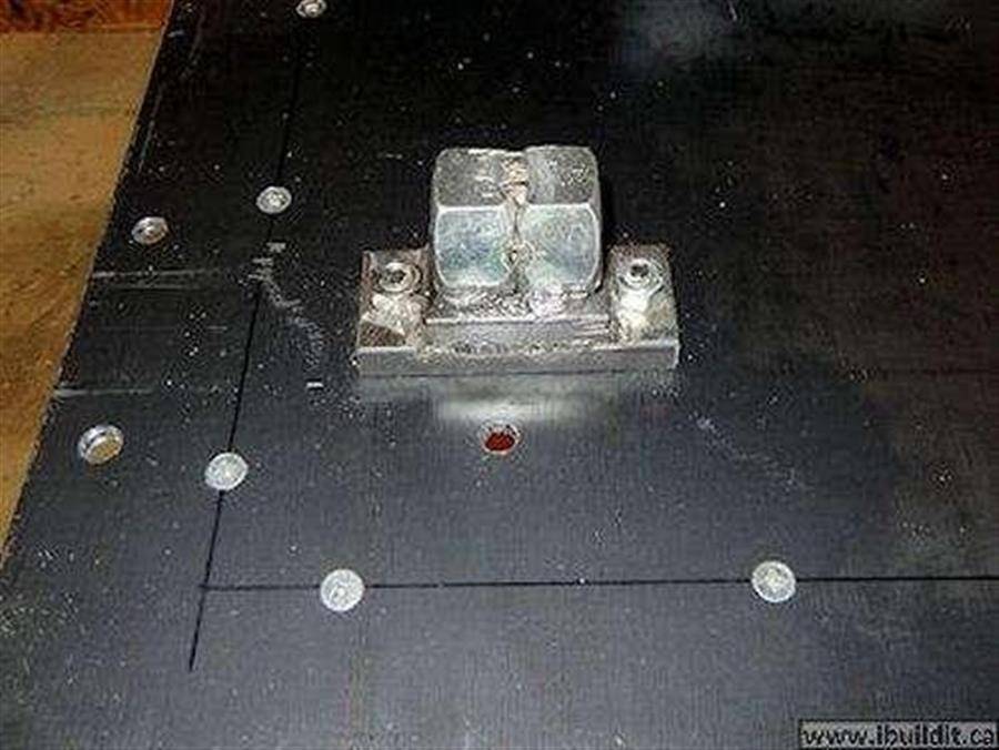 Закрепить тиски на слесарный верстак, задача вроде не сложная, но есть свои нюансы. Первый шаг, это рассчитать и просверлить отверстия для крепления. Проверти, что они нормально проходят в тисках и столешнице. Для того, чтобы обеспечить некоторую дополнительную защиту от повреждения рабочей поверхности стола, подложите кусок стальной пластины выше и ниже поверхности стол. В данном случае использовалась 75мм оцинкованная сталь, которую разрезают с биметаллической пластинкой до 165мм кв. После того, как все отверстия просверлены ложите верхнюю пластину в нужном положении, и вставляете боковые болты через шайбы, затем затягиваете нижние болты.