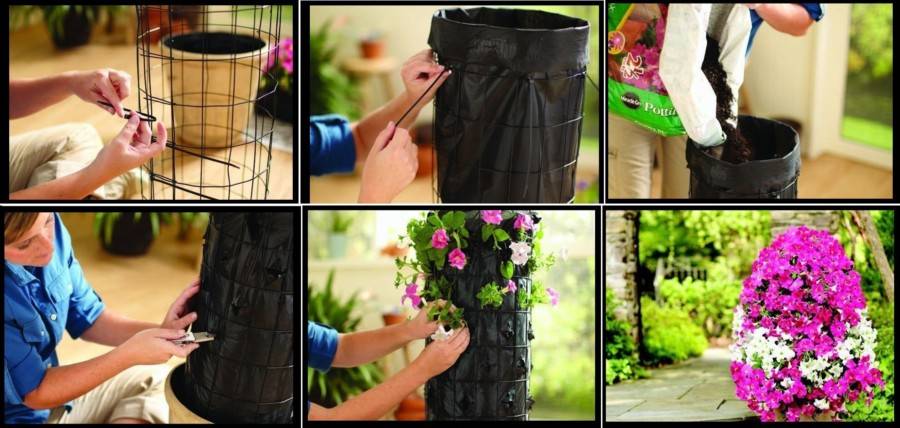 Из металлической сетки сделайте каркас и вставьте в него горшок цилиндрической формы нужного диаметра. Внутри каркас застилают агропленкой и аккуратно ее закрепляют. До того как вы насыпете субстрат, в каркас вставляют шланг с отверстиями для полива изнутри. Затем конструкцию присыпьте грунтом. Почву полейте, дайте ей полностью осесть и досыпьте почти до верха горшка. После этого можно высаживать растения.