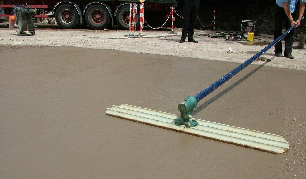 Чтобы получить ровное и уплотненное покрытие, нужно вести рейку неспешно, уделять внимание проблемным местам на бетонной поверхности, периодически прочищать рабочую раму от материала, который будет на нее налипать