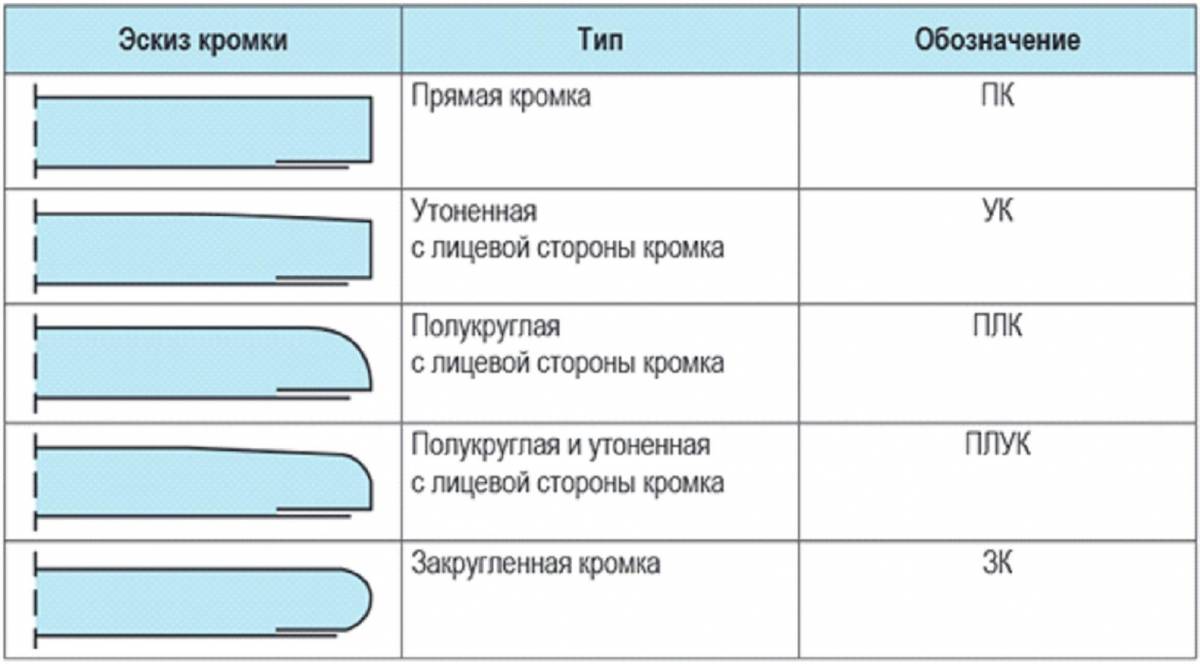 - ПЛУК/HRAK — кромка утоненная с лицевой стороны и полукруглая. Применяется для производственных и жилых помещений, требует армирования швов и использования шпаклевки.