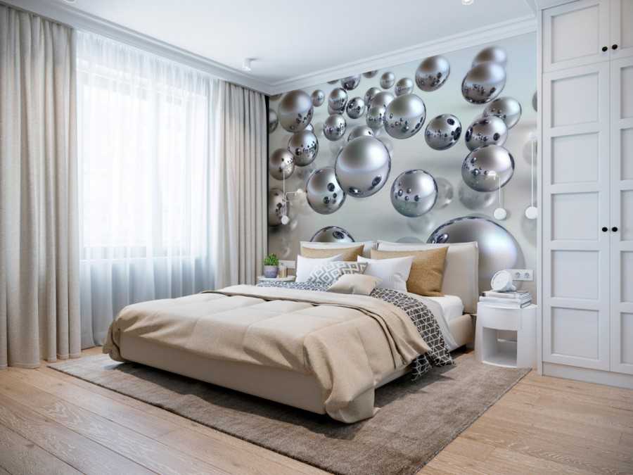 - Если спальня квадратная, сделайте акцент на одной из стен, оклеив ее яркими обоями.