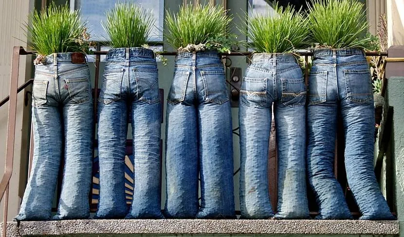 Забавную ограду можно сделать из старых джинсов. Брючины зашивают снизу по краю, набивают галькой и ставят вдоль изгороди из сетки-рабицы. Для надежности рекомендуем зафиксировать тумбы проволокой. Сверху устанавливают горшки с растениями.
