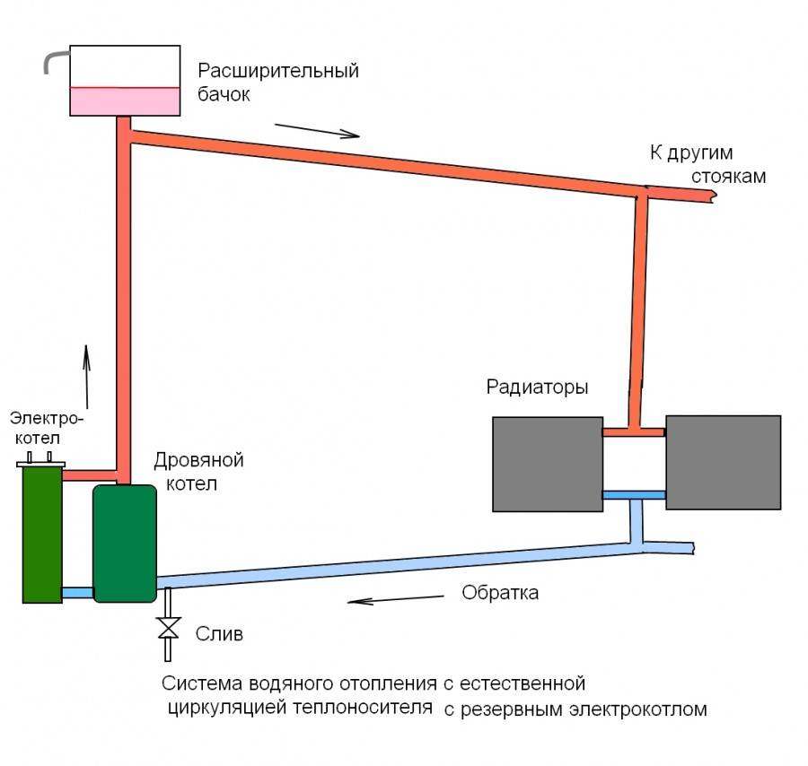 Такая система функционирует, благодаря разной плотности горячей и холодной воды. С возрастанием температуры плотность теплоносителя уменьшается, и он становится легче. Теплые массы занимают верхние позиции в системе, уступая нижние более холодным. Это приводит к естественной циркуляции воды в системе отопления. Основное достоинство данной системы – независимость от электроснабжения. Недостатков значительно больше: