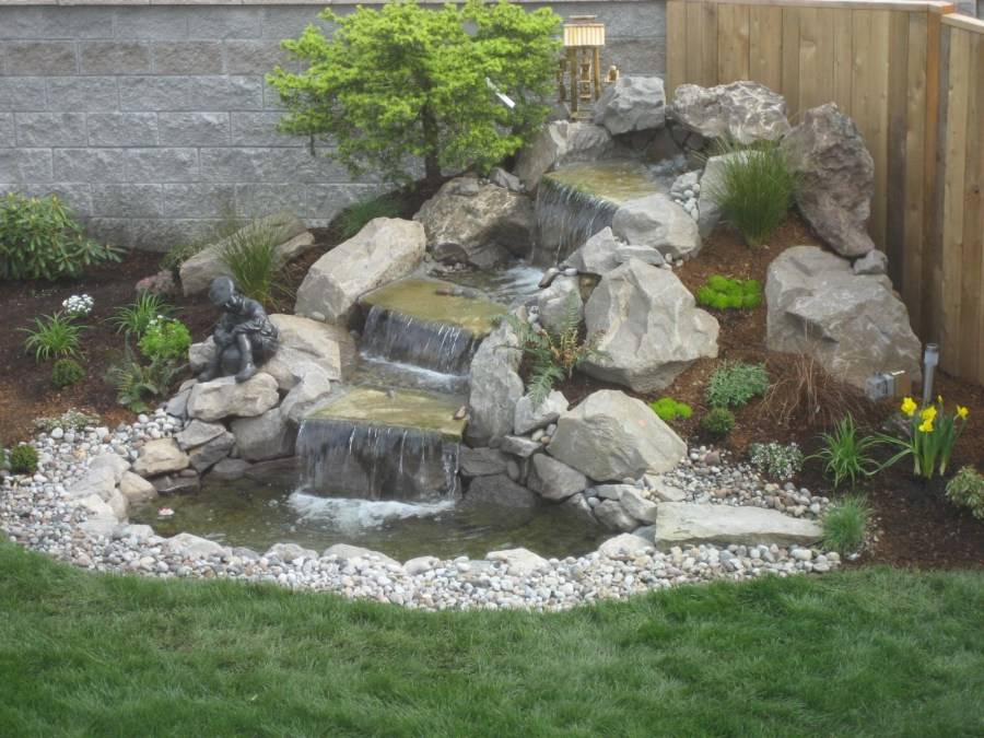 Проще всего, создать жесткую форму, скажем, сосуд и задекорировать его, используя для этого камни. Если же вы предпочитаете оставаться во всем индивидуальными, то тут не будет места заготовкам, все следует делать собственноручно. Для устремления водного потока вниз, с эффектом разбивания его на ручьи и струйки, продумайте возможные препятствия. Это могут быть уступы небольшой высоты – около 30 см. Создание уступа лучше начинать снизу, плавно поднимая его над водой. Оптимальный размер каскада составляет 1,5 м.