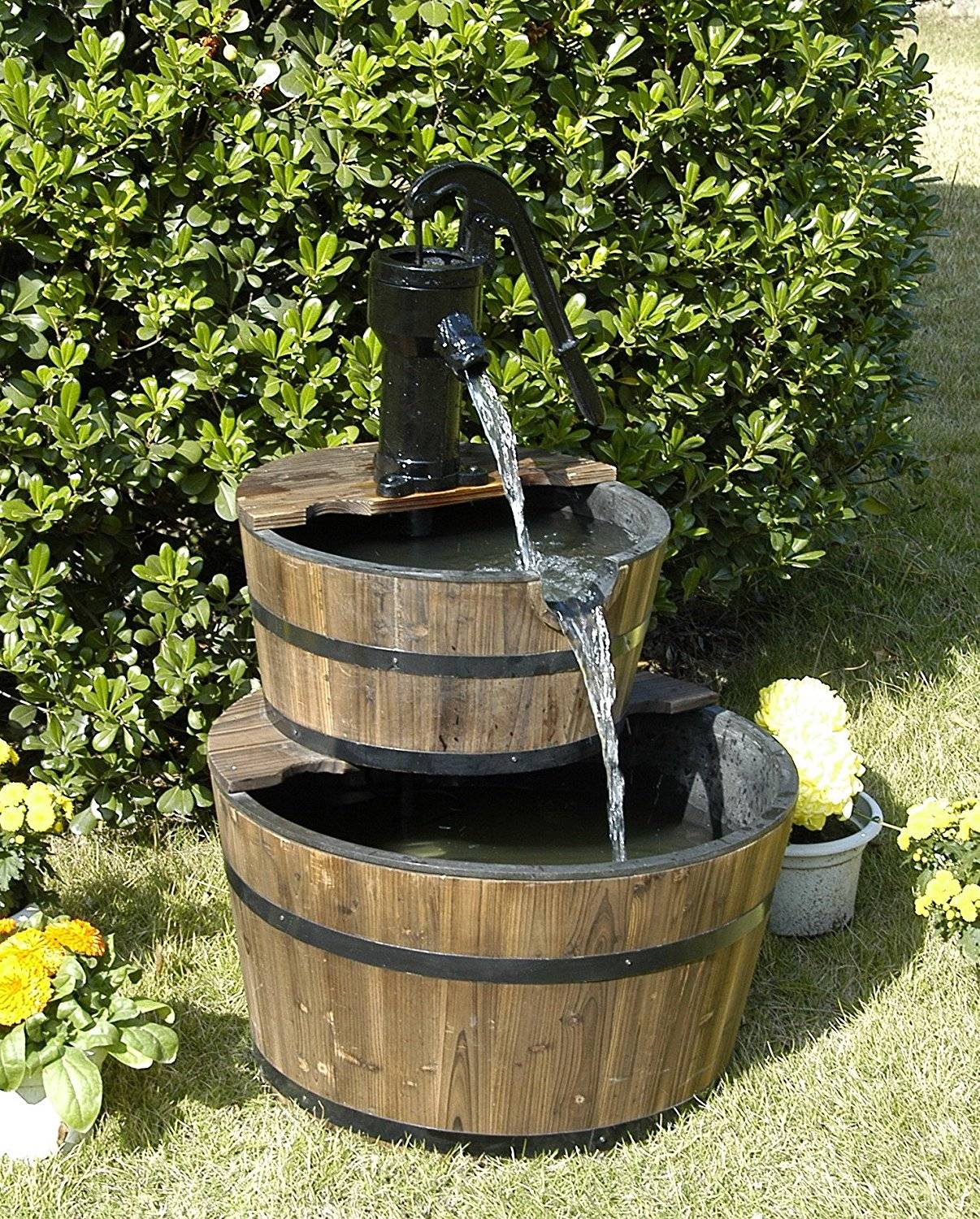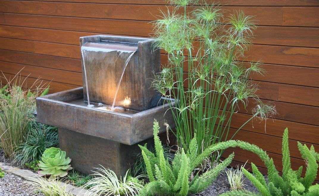 Построить такой водопад проще, чем ландшафтный. Ведь вам не нужно рыть котлован, укреплять его стенки, сооружать и бетонировать горку, подбирать мощный насос, а после прятать его в пруду. Для миниатюрного водопада будет достаточно лишь большой чаши, которая будет служить резервуаром, небольшого насоса и стойки, чтобы расположить на ней емкости, из которых будет литься вода.