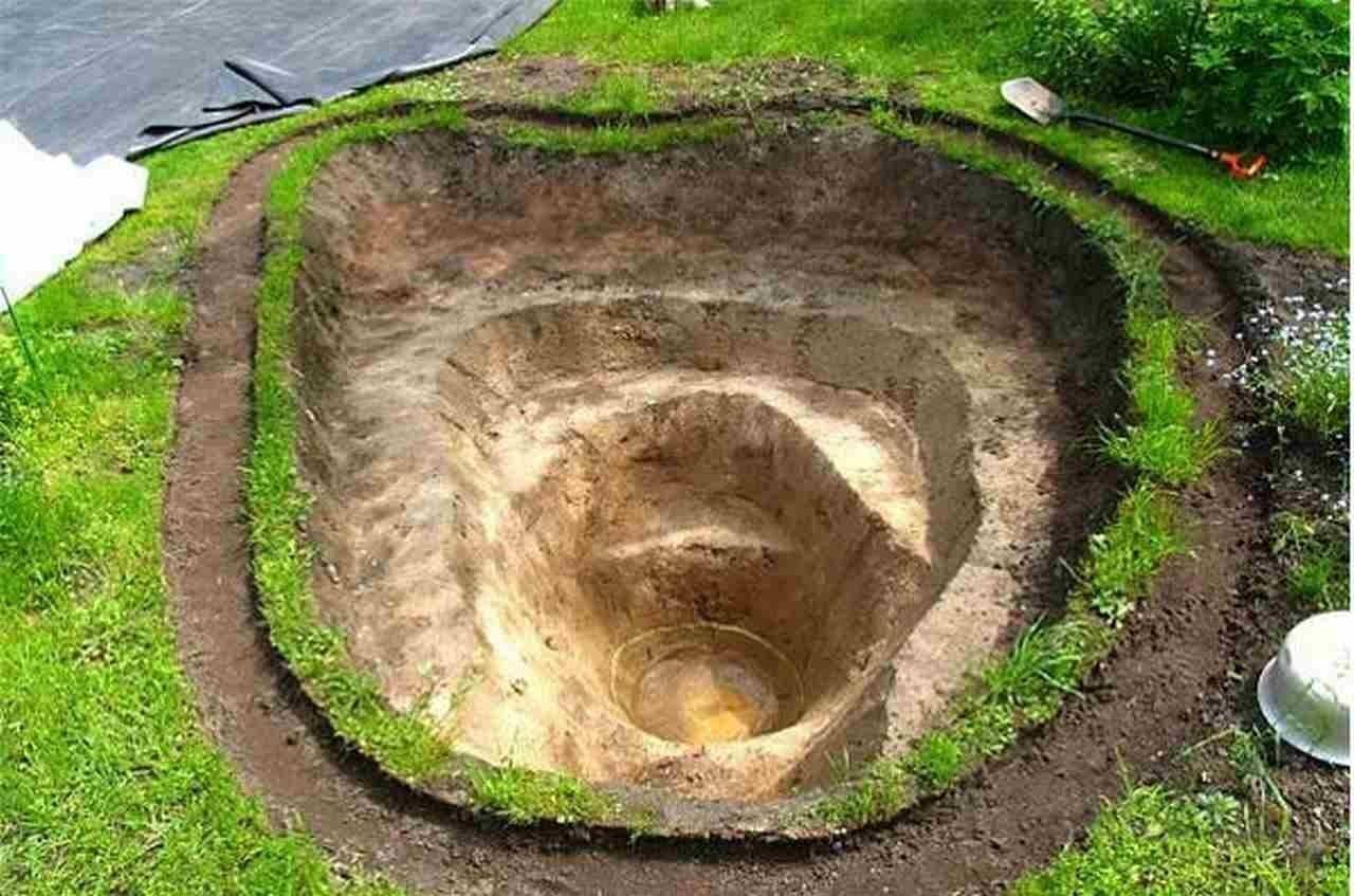 Когда вопросы с размерами и суммами решены, можно браться за рытье котлована под чашу. Для этого нанесите на землю форму будущего водоема и выкопайте яму нужной глубины.