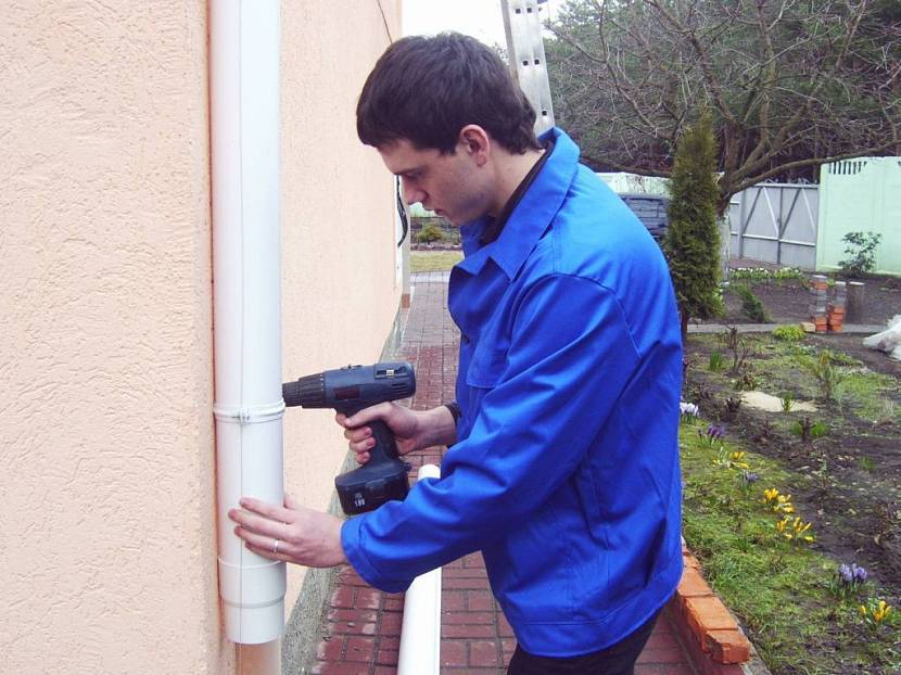 - Закрепите вертикальный участок водостока на стеновой поверхности.