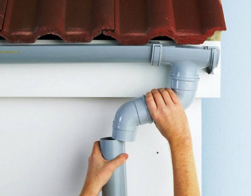 Важный момент – монтаж водостока (стояка) у карниза крыши, где используются отводы. Потому что свес кровельного материала располагается от поверхности стены на расстоянии 30-50 см. А значит, чтобы соединить воронку с трубным стояком, нужны два отвода под 45°. Если свес кровли большой, то между отводами монтируется кусок трубы под наклоном.
