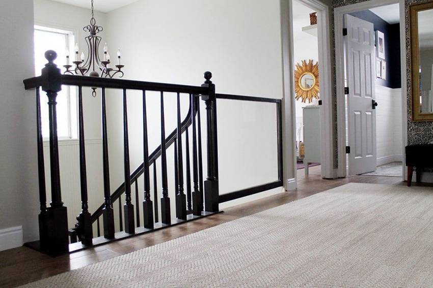 Ограждение перил. Этот элемент целесообразно использовать, если перила имеют большие просветы между балясинами, что чаще всего бывает у кованых изделий и художественных, дизайнерских перил. Для того чтобы и ребенка обезопасить, и внешний вид не испортить, с внутренней стороны устанавливается прозрачный экран из прочного пластика. Он бесцветный, а значит, будет совершенно незаметным.