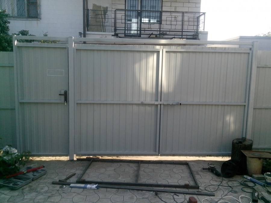 Это более простые ворота из профнастила с калиткой, состоящие из 1 или 2 поворотных полотен, каждое из которых установлено на отдельном опорном столбе. Калитка для прохода людей может быть смонтирована отдельно или располагаться на поверхности одной из створок.
