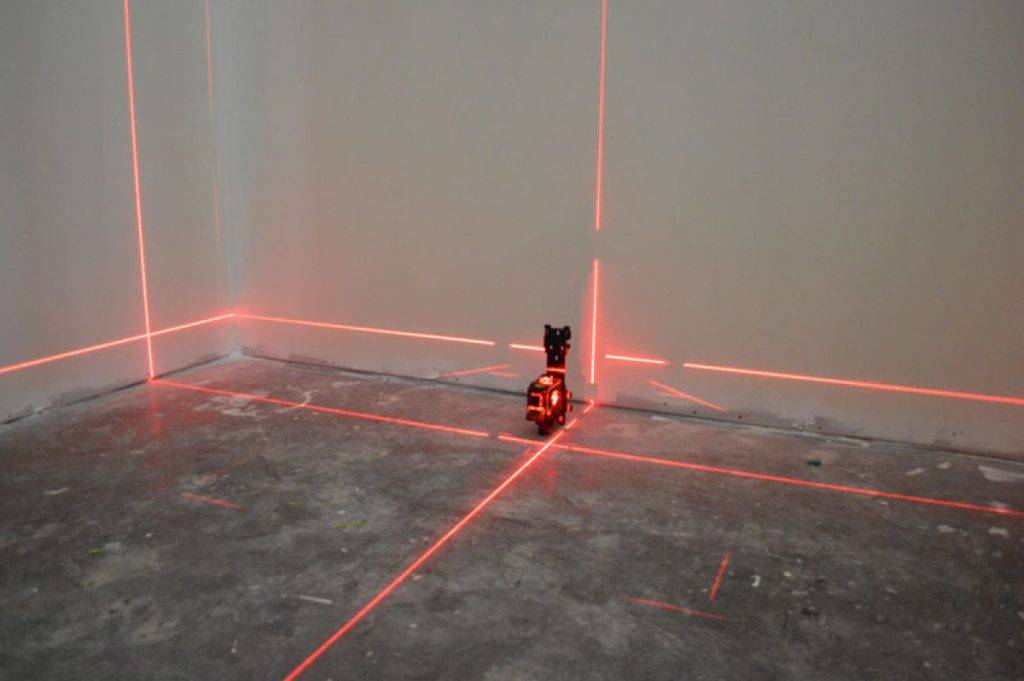 Автор более продвинутого метода рекомендует ориентироваться сразу на лазерную линию. Визуально. По его утверждению невооружённым глазом видно, пересекает ли луч хоть одну точку стены. Нивелир буквально вручную двигается прочь от стены до тех пор, пока не окажется в нужной плоскости. Здесь самое главное выдержать перпендикулярность с примыкающими стенами. После установки лазерного нивелира в нужное положение следует сдвинуть его плоскость на несколько сантиметров назад. Это расстояние аналогично минимальному удалению от стены из прошлого пункта откладывается на правиле. Дальнейшие действия в точности повторяют приведённые выше.
