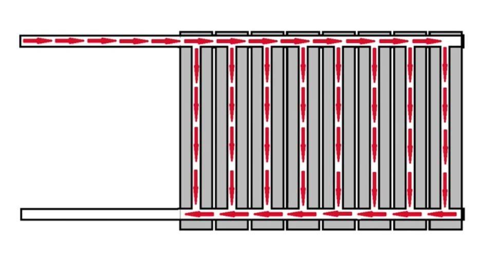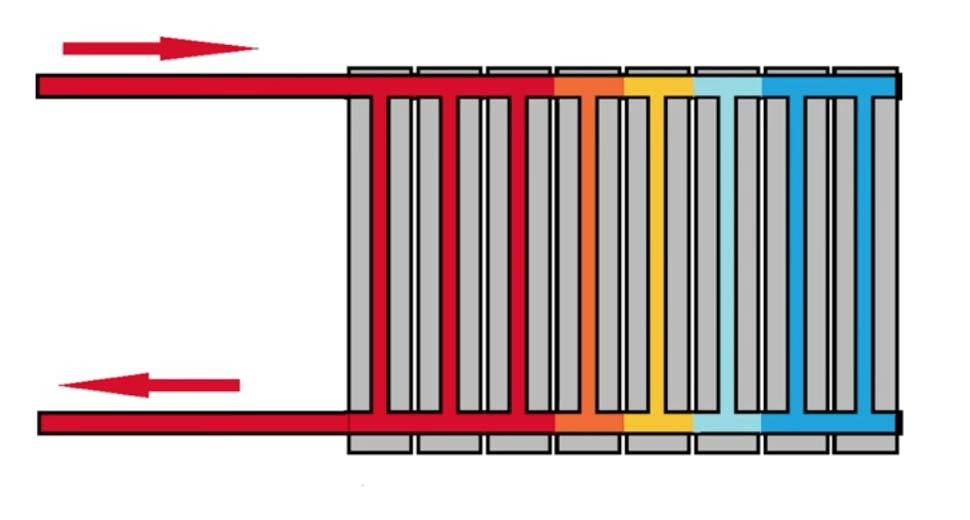 Это связано с длиной пути, если для ближней секции он составляет 8-10 см ширины секции, вертикальный трубопровод и 8-10 см до выхода, то для дальней секции этот путь длиннее в разы. За то время, пока теплоноситель дойдет до дальней секции, а затем вернется обратно, через ближнюю секцию может пройти в два-три раза больший объем. Из-за этого процесс нагревания батареи происходит неравномерно, дальние секции могут быть чуть теплыми, в то время как ближние ко входу и выходу будут горячими.