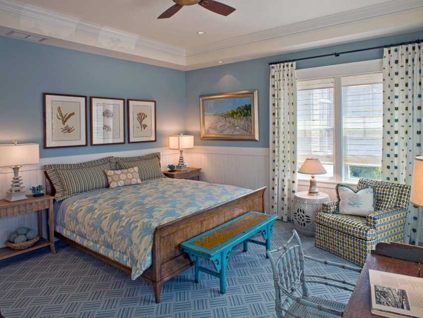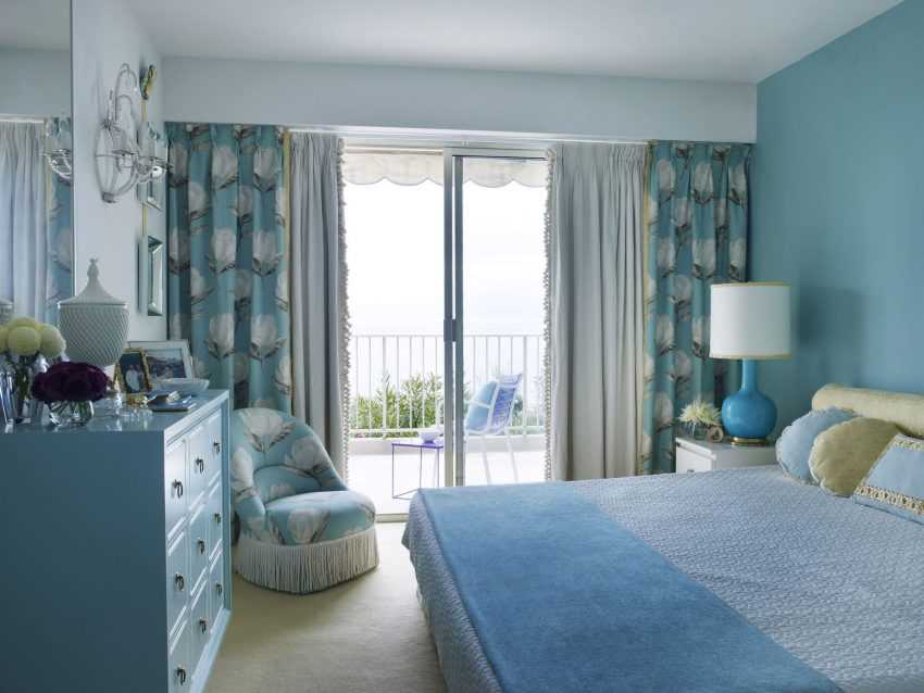 Шторы голубого цвета и зеленая гамма интерьера спальни – это небо и зелень. Здесь очень важен вопрос насыщенности этих цветов. Желательно добиться их плавного перехода во избежание резкого контраста.