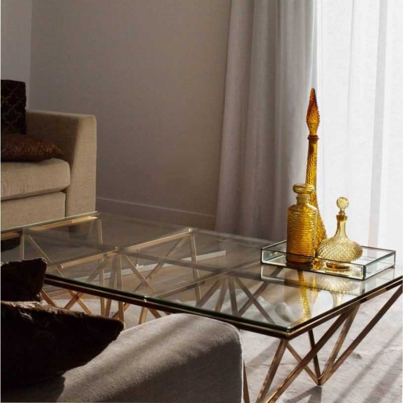- Стекло, которое всегда сочетается с деревом или металлом. При этом стекло может быть матовым, прозрачным или тонированным. Визуально такие изделия смотрятся легко и элегантно. Но, как и у каждого материала, у стекла есть ряд недостатков: нужен особый уход, завышенная цена и неприятный звук при соприкосновении с другими материалами.