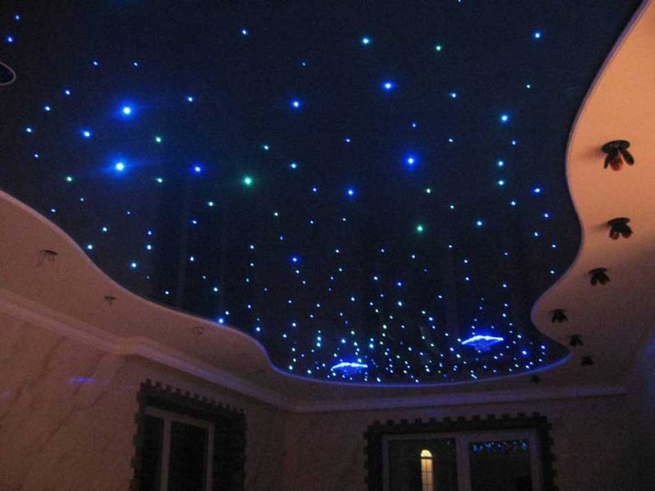 Натяжной потолок звездное небо можно получить при помощи светодиодов, чаще всего их используют вместе с оптоволокном для качественного монтажа. Такой способ позволит создать эффект луны и крупных звезд.